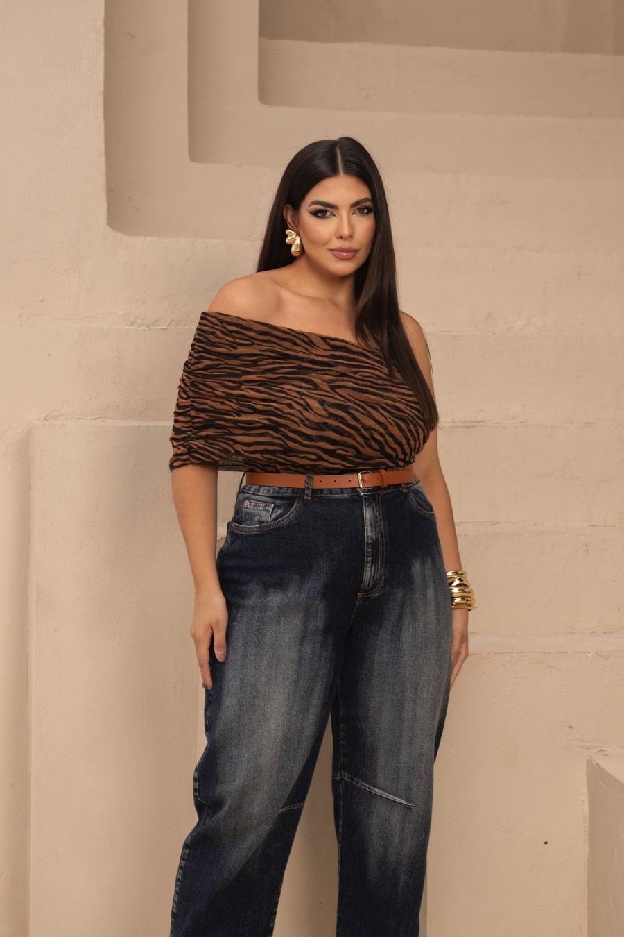 Blusa Ombro Único Drapeada Animal Print Quality Moda Plus Size dvs Alto