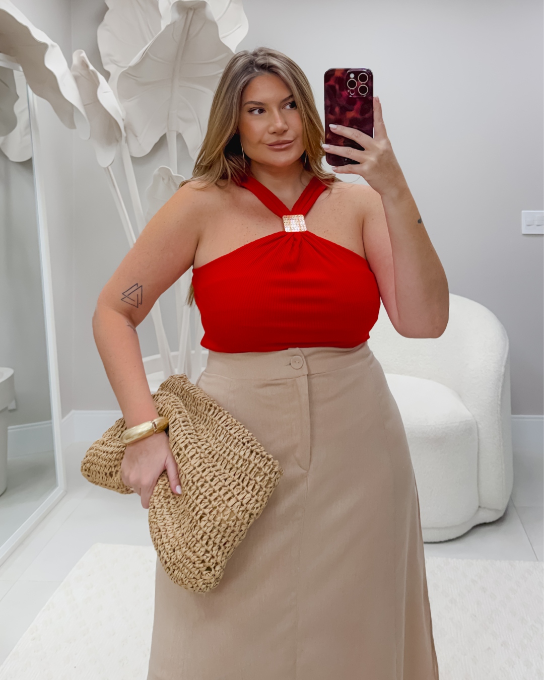 Uma blusa deslumbrante em tom de vermelho vibrante, considerada "um dos [looks] preferidos" pela modelo. É confeccionada em "malha canelada com muito elastano", sendo "muito confortável" e com um "toque... diferenciado".