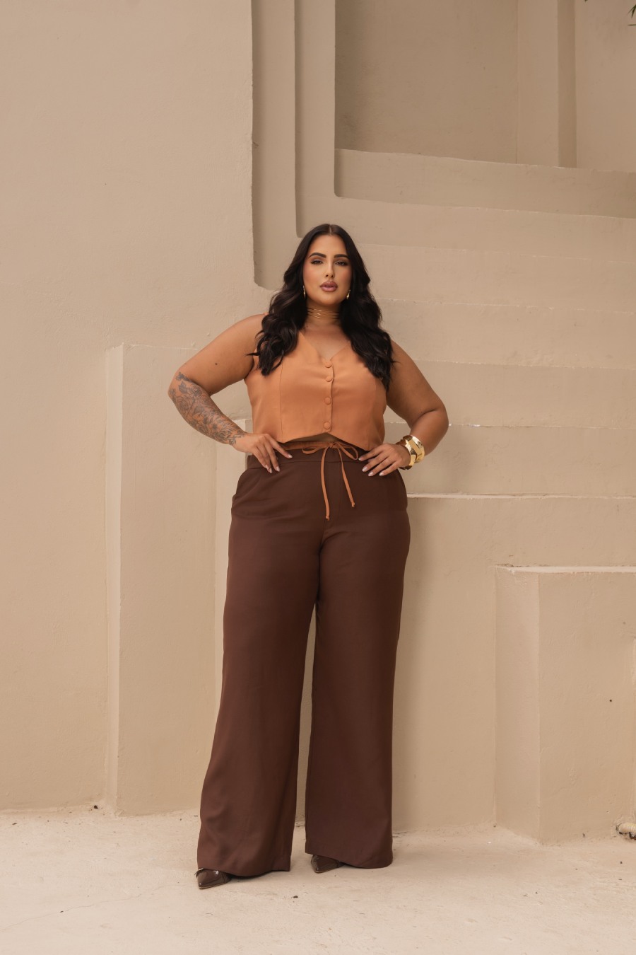 Calça Detalhes no Cós Ocre Quality Moda Plus Size dvs Alto