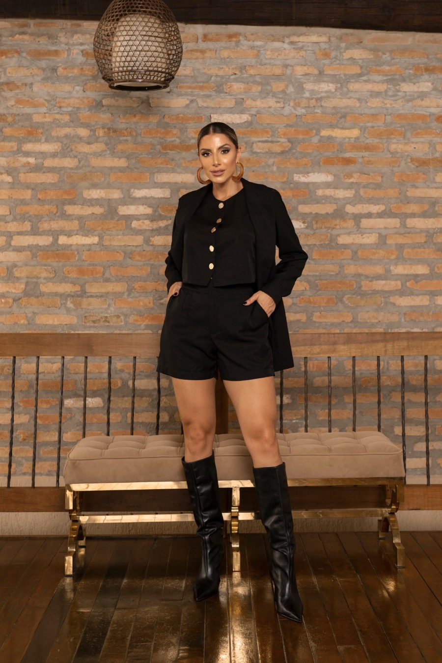 Conjunto composto por colete cropped com fechamento frontal em botões metálicos e recortes frontais e posteriores que favorecem o caimento da peça. O shorts em modelagem de alfaiataria possui pregas frontais, bolsos e cós com elástico na parte posterior, proporcionando conforto e ajuste ao corpo. Uma proposta elegante e versátil.