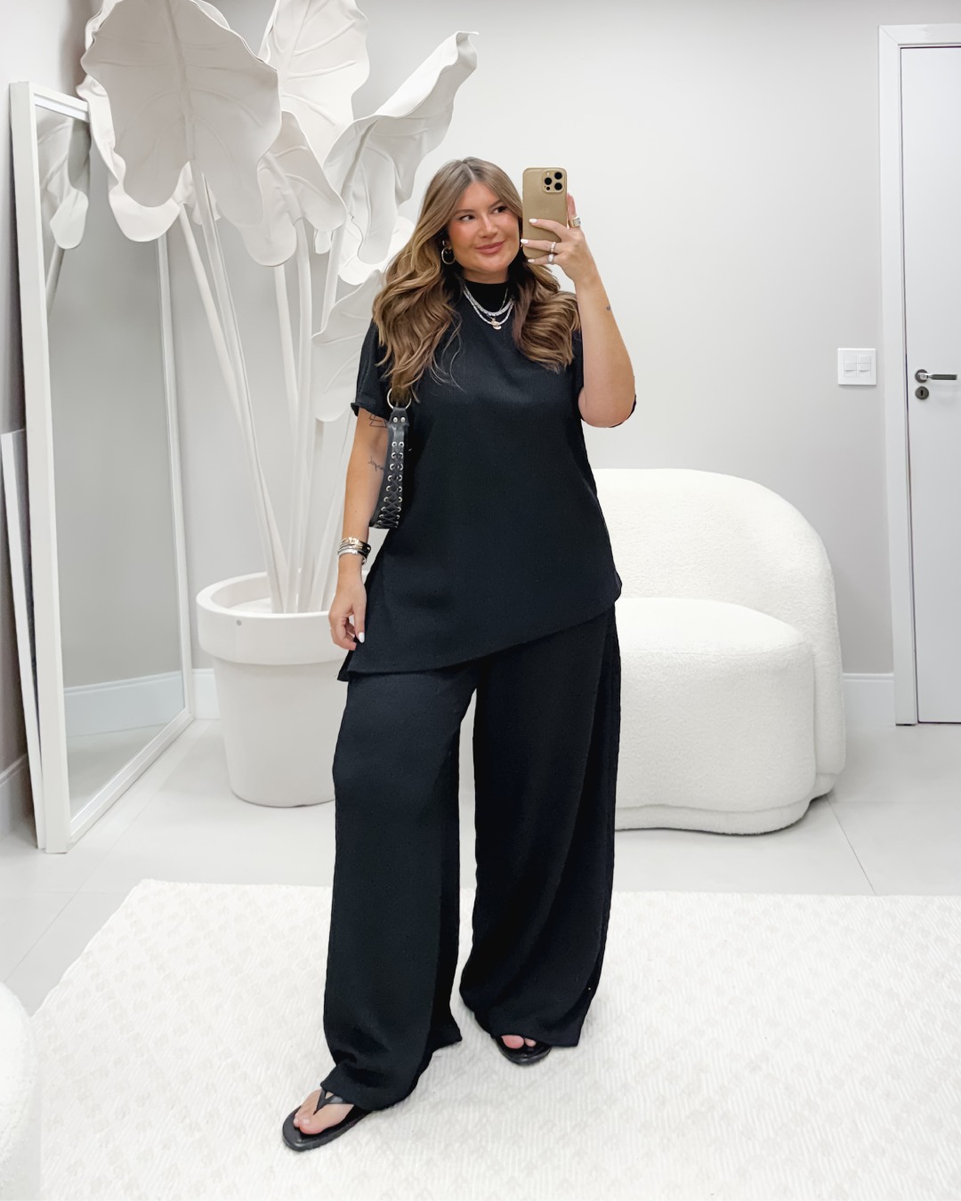 Calça de modelagem pantalona bem ampla e solta, feita no mesmo tecido texturizado e flexível da blusa, garantindo conforto extremo com sua cintura alta e cós totalmente em elástico.