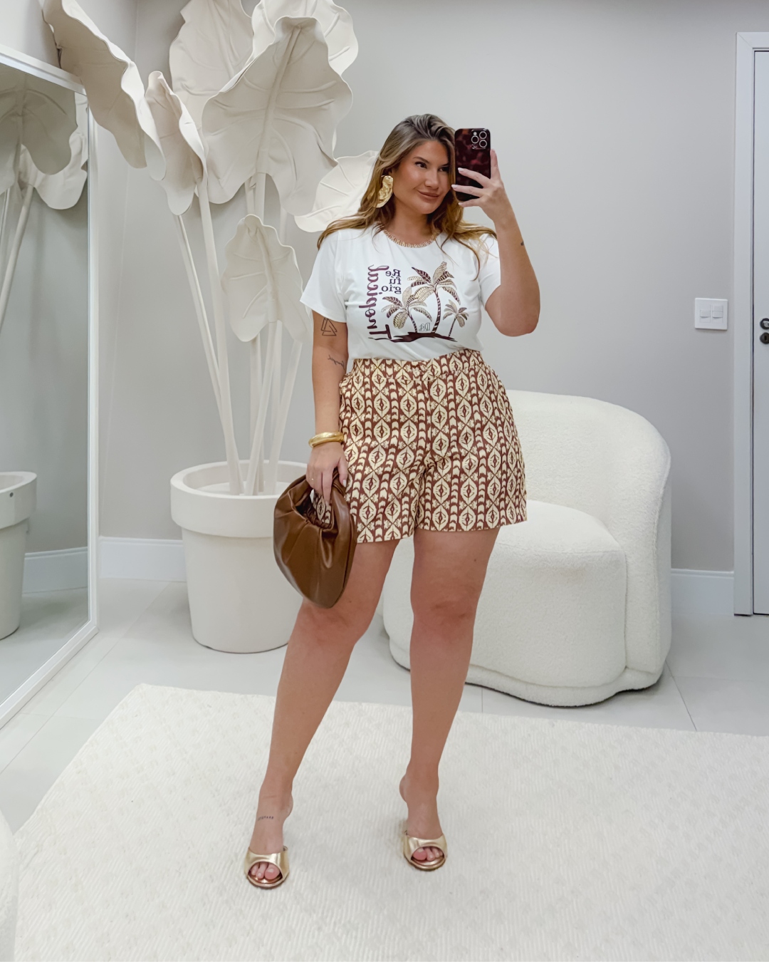 Uma bermuda "bem alfaiataria" em tom natural, "bem a cara do verão". É uma peça "muito confortável", confeccionada em um "tecido com bastante elastano" que se ajusta bem ao corpo, unindo elegância e praticidade.
