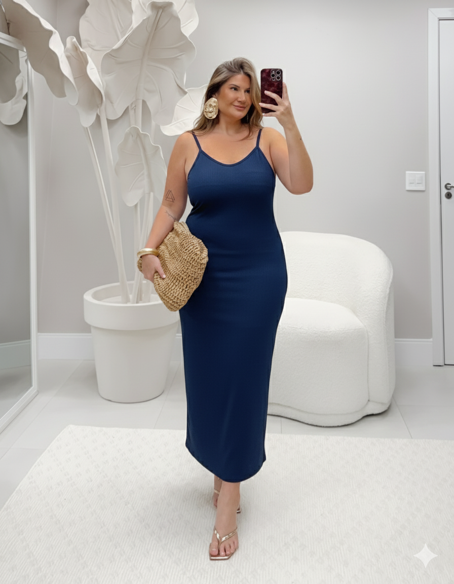 Design Inteligente e Moderno O design foca na versatilidade e nos detalhes que elevam o básico. O comprimento "midi" é elegante, enquanto o decote V é valorizado pelas alças finas, que contam com um charmoso detalhe de "peças mais redondinhas" (bolinhas).