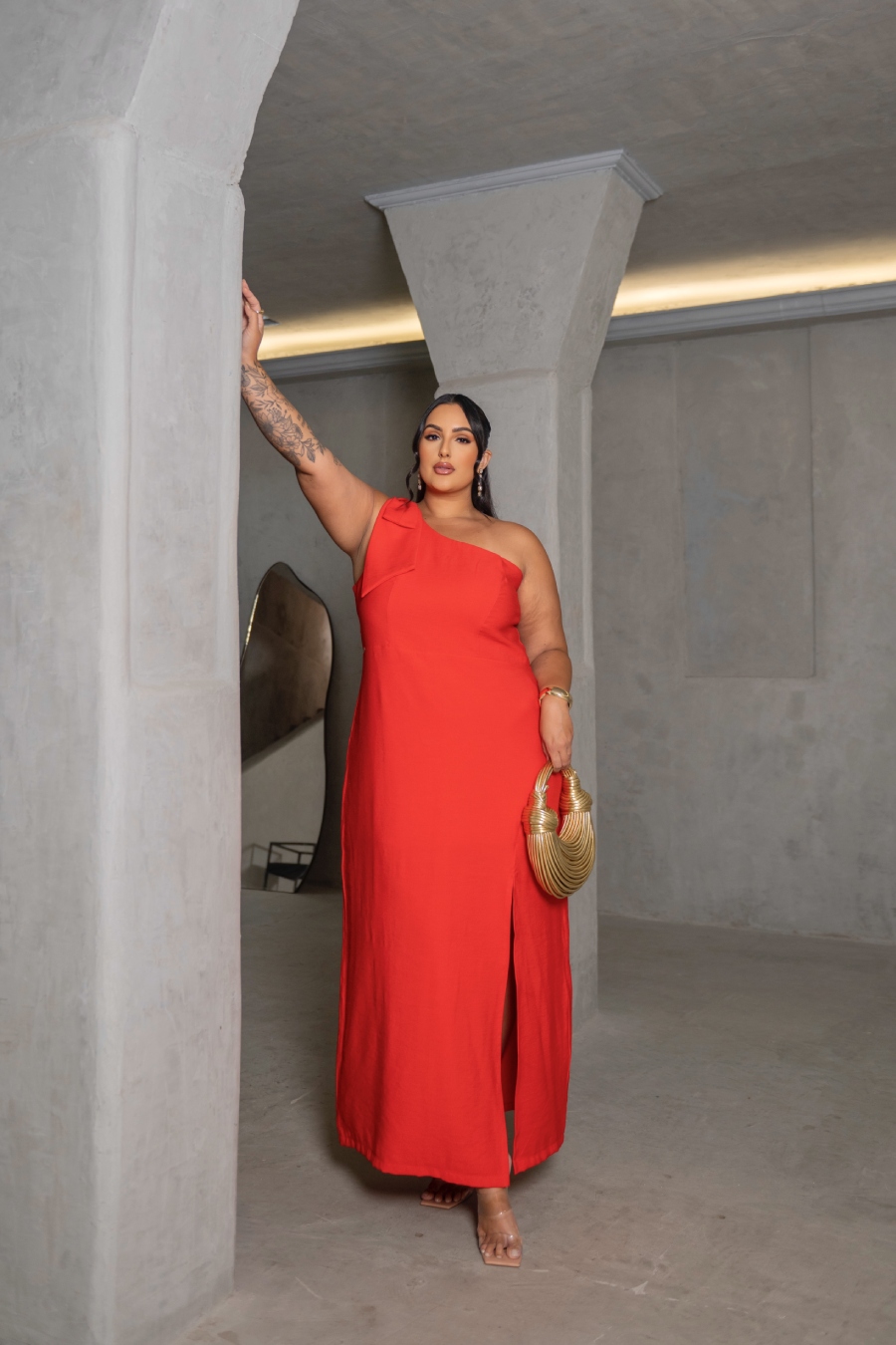 Vestido Ombro Único e Fenda Vermelho Quality Moda Plus Size Milliossi Verão loja