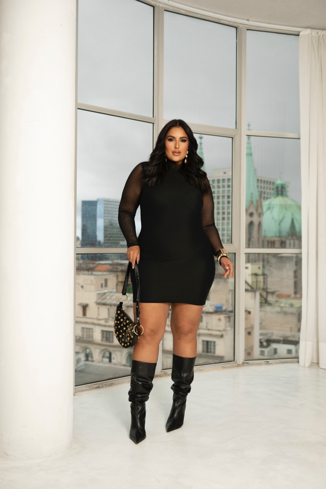 Vestido curto ajustado em tule liso com mangas longas e transparência sutil, criando um visual sofisticado e moderno. A gola alta reforça a elegância da peça, tornando-a uma escolha estratégica para composições de inverno